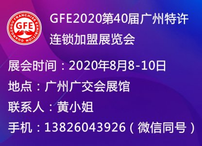 由广州连锁经营协会、富众国际集团联合主办的“GFE2020第40届广州特许连锁加盟展览会”将于2020年8月8-10日在广州琶洲展馆举办,诚邀各连锁加盟企业参展。