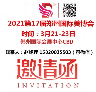 20 21 第 17 届 郑州 国际 美容院线产品及化妆品展览会 时间: 3 月 21-23 日 地址:郑州国际会展中心 ( 郑东新区中央商务区 CBD) CBD) 邀 请 函 郑州 国际 美博会属于中原地区,辐射周边八……阅读全文>>展会日期:2021-03-21至2021-03-23  举办展馆:郑州CBD国际会展中心