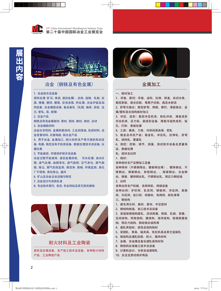 1、冶金技术及设备:原料处理(矿石、焦炭、废旧金属)、冶炼、连铸、轧制、拉拔、精整、镀锌、镀锡、彩色涂层、热处理、冶金炉窑及加热设备、冶金辅助设备、备品备轧(轧辊、轴承、齿轮、法兰、管轧、泵、阀等);