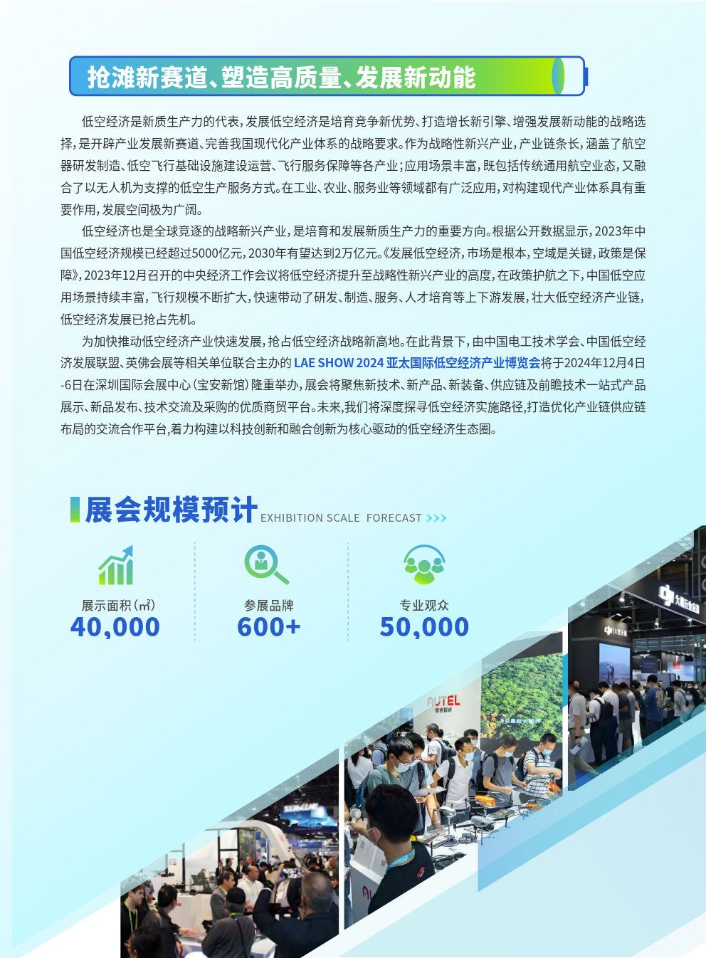 为加快推动低空经济产业快速发展,抢占低空经济战略新高地。在此背景下,由中国电工技术学会、深圳汽航院、中国低空经济发展联盟、英佛会展等相关单位联合主办的 LAE SHOW 2024 亚太国际低空经济产业博览会将于2024年12月4日-6日在深圳国际会展中心(宝安新馆)隆重举办,展会将聚焦新技术、新产品、新装备、供应链及前瞻技术一站式产品展示、新品发布、技术交流及采购的优质商贸平台。未来,我们将深度探寻低空经济实施路径,打造优化产业链供应链布局的交流合作平台,着力构建以科技创新和融合创新为核心驱动的低空经济生态圈。