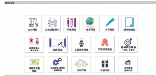 办公用品,办公设备/耗材,学生用品,教学用品,书写用品,本册,纸制品,绘画及画材美术用品,文房四宝,礼品文具,印刷与包装用品,现代办公设备及教学仪器,机械设备,原材料及零配件,其他文化行业相关产品等。