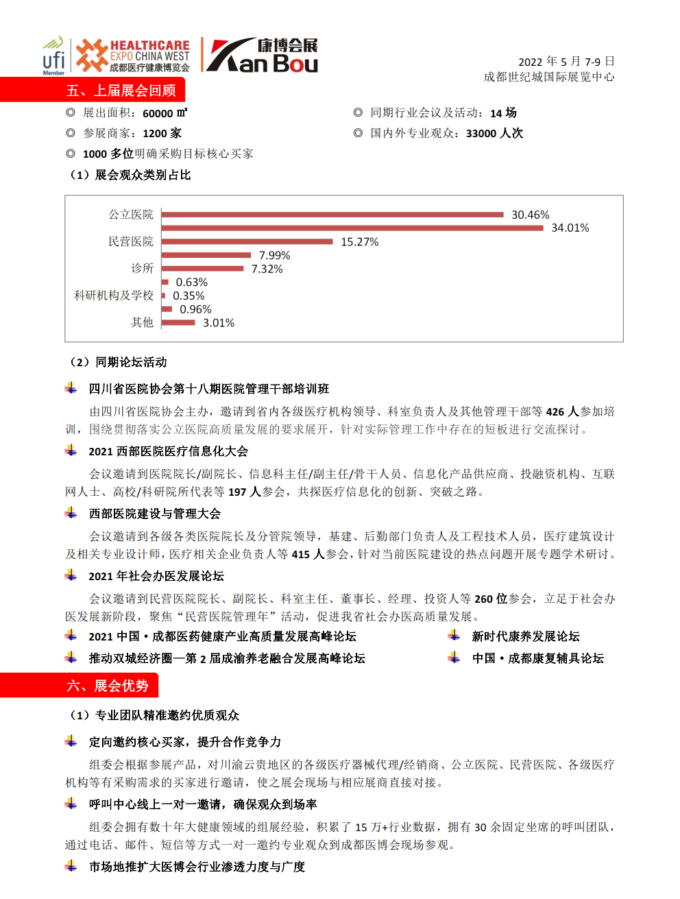 “成都医疗健康博览会”(简称:成都医博会)经过二十多年来的不断发展,拥有西部医疗卫生行业庞大的数据资源,能为医疗行业提供更完善的采购解决方案。医博会在2020年通过UFI认证,正式进入国际性品牌展会行列。展会同期先后创立了医院管理干部培训班、社会办医发展论坛、西部医院医疗信息化大会、西部医院建设与管理大会等高端学术会等,已成为西部地区医疗行业内了解行业发展动态、交流学术、采购产品的重要平台。