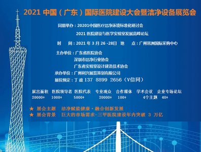 2021第二届中国(广东)国际医院建设大会 暨医学实验室装备展览会 同期举办: 2021 医院消毒与感控暨洁净环境展览会 2021 医学实验室可持续发展高峰论坛 2021 医院建筑与装备大会(学……阅读全文>>展会日期:2021-03-26至2021-03-28  举办展馆:广州琶洲国际采购中心