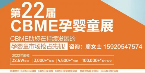 婴童展会-年度盛会,2022年仅此一届,错过将再等一年。渠道拓宽会,市场布局~ 2022CBME孕婴童食品展 始于2001年的CBME中国展,至今已成功举办21届,包括CBME孕婴童展及CBME童装展,CBME食……阅读全文>>展会日期:2022-07-06至2022-07-08  举办展馆:上海 | 国家会展中心