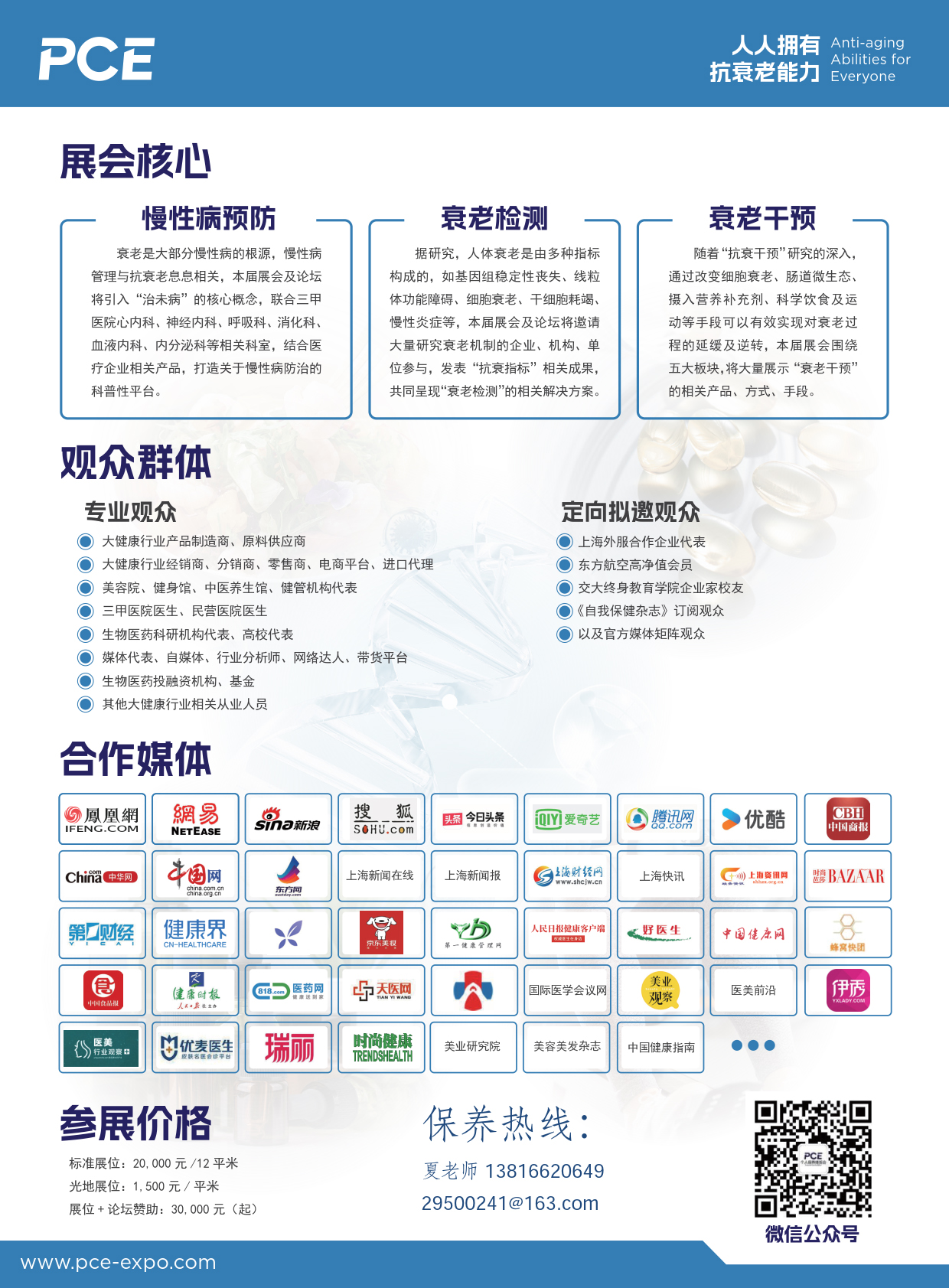 个专题展,从产品角度展示抗衰理念,结合各类慢性病管理方案,提升社会的抗衰能力与认知,让“人人拥有抗衰老能力”的理念深入人心,为社会提供技术科普一站式综合解决方案,实现对专业人士的资源对接。
