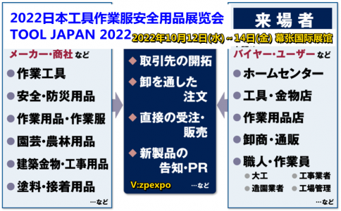 工具・作業服・安全用品などの専門展 展会时间:2022年10月12日(水)~14日(金) 展馆地址:东京幕张国际展览中心 主办单位:RX Japan株式会社 (日本励展集团) 中国组展社:上海福贸展览服务有限公司 展位咨询:Mr张鹏158-2110-6898-微-信 | カー用品・整備工具ゾーン 塗料・接着用品ゾーン 建築金物ゾーン 安全・防災用品ゾーン 作業服・作業靴ゾーン 作業工具ゾーン 園芸道具ゾーン 作業用品ゾーン | |