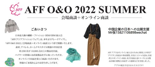 「AFF(アジアファッションフェア) 」は、10年以上に渡り開催している日本***の中国繊維・アパレル製品展示会「CFF(チャイナファッションフェア)」を改称したものです。毎年、春は大阪、秋は東京で開催しており、今回で33回目を迎えます。出展企業の繊維・アパレルの輸出総額は日本の対応する製品の輸入総額の15% 以上を占め、アパレル業界のOEM・ODM の最新動向を反映しています。