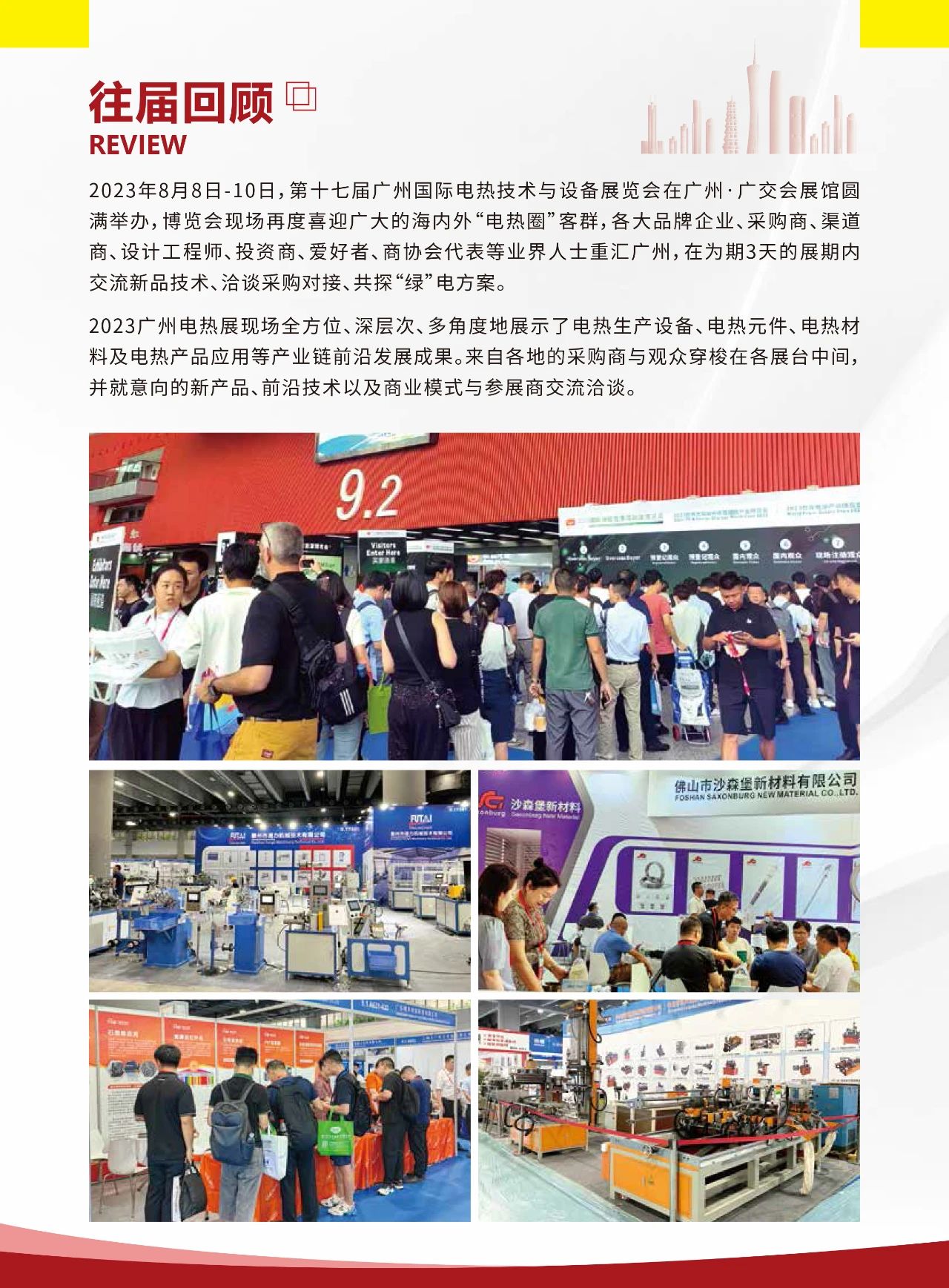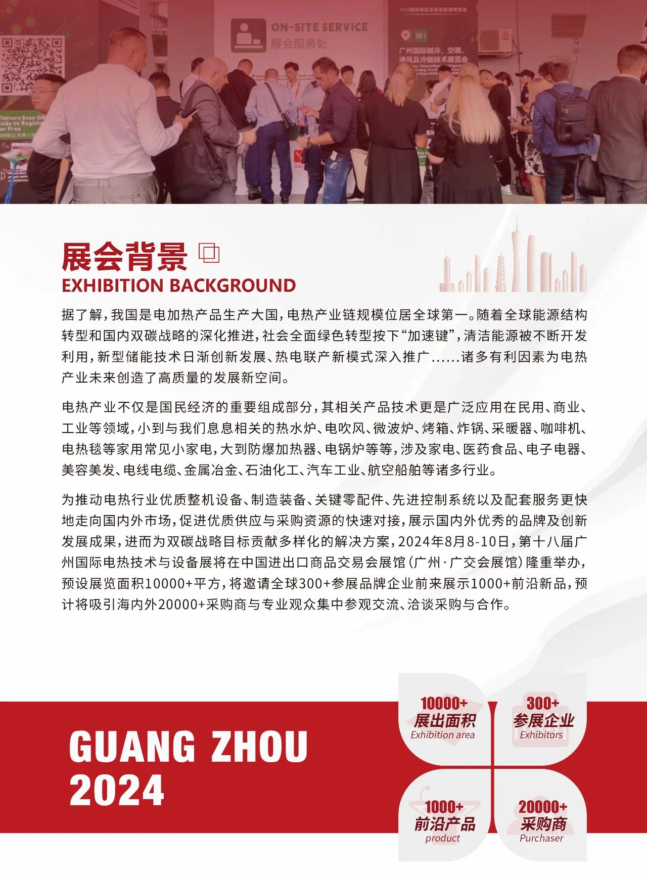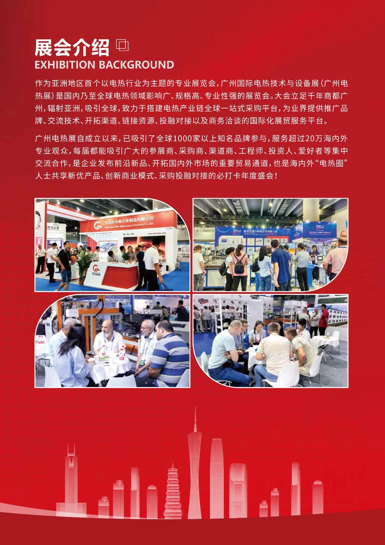 广州国际电热技术与设备展始于2005年,作为亚洲地区首个以电热行业为主题的专业展览会,成功为电热技术与设备行业搭建了品牌推广、渠道拓展、技术交流、贸易成交、人脉积累的国际化一站式全球展贸商务服务平台,历经十多年全球推广和品牌沉淀,广州电热展已成为产业人士“贸易全国·直通全球”的博览盛会。