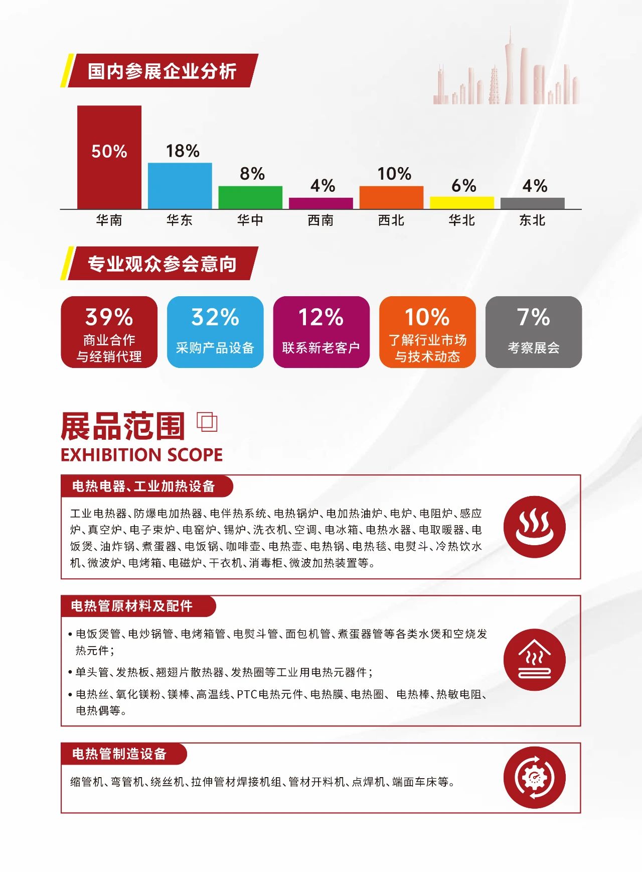 展品范围:电热电器、工业加热设备、电热管原材料及配件、电热管制造设备等。
