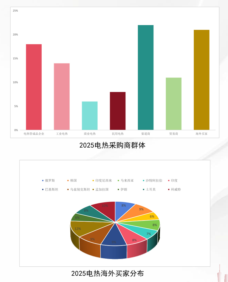 从采购商群体来看,涵盖电热管成品企业、工业电热、商业电热、民用电热、渠道商、贸易商、海外买家等多个领域,各群体占比分布均衡,精准覆盖行业上下游需求。海外买家更是来自俄罗斯、韩国、印度尼西亚、马来西亚、沙特阿拉伯、印度、巴基斯坦、乌兹别克斯坦、孟加拉国、伊朗、土耳其、科威特等多个国家,国际化程度颇高。