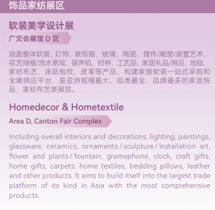 Including overall interiors and decorations, lighting, paintingsglassware, ceramics, ornaments/sculpture/installation art,flower and plants/fountain, gramophone, cock, craft gifts,home gifts, carpets, home textiles, bedding pillows, leatherand other products. lt aims to build itself into the largest tradeplatform of its kind in Asia with the most comprehensiveproducts