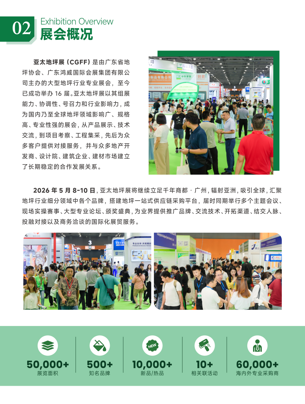 亚太地坪展(CGFF)是由广东省地坪协会、广东鸿威国际会展集团有限公司主办的大型地坪行业专业展会,至今已成功举办16届。亚太地坪展以其组展能力、协调性、号召力和行业影响力,成为国内乃至全球地坪领域影响广、规格高、专业性强的展会,从产品展示、技术交流,到项目考察、工程集采,先后为众多客户提供对接服务,并与众多地产开发商、设计院、建筑企业、建材市场建立了长期稳定的合作发展关系。