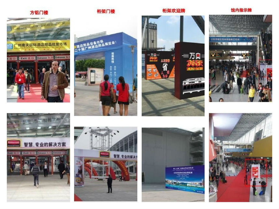 展馆内单面指示牌3000元(备注:1/3版面为展会指引,3/2版面为企业广告),桁架欢迎牌28000元(6m(长)*3m(高)),桁架门楼35000元(内空:12m(长)*5m(高)),方铝门楼35000元(内空:10m(长)*4.5m(高))。