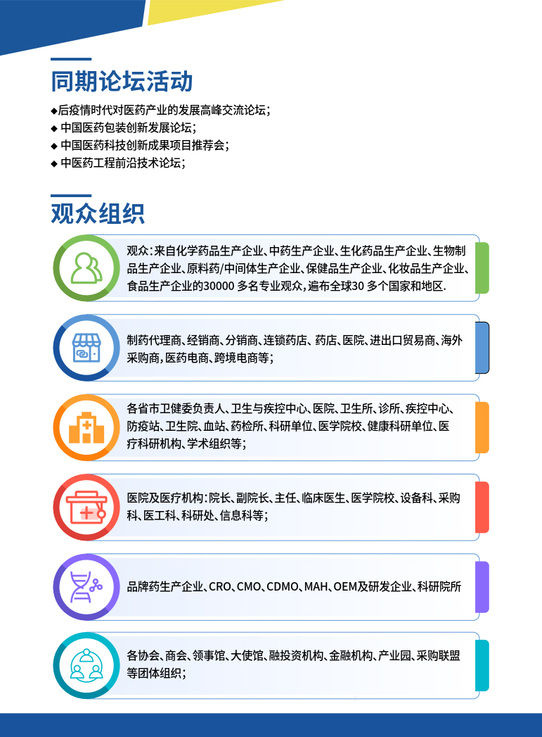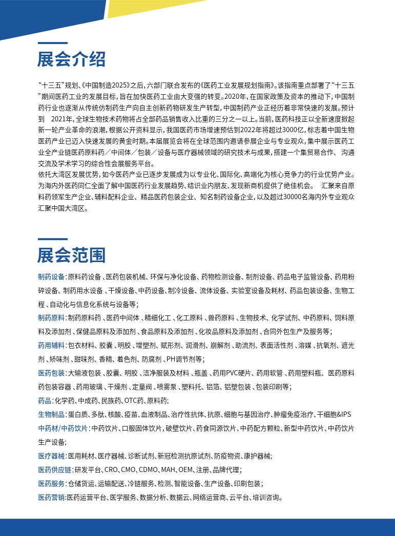 “十三五”规划、《中国制造2025》之后,六部门联合发布的《医药工业发展规划指南》。该指南重点部署了“十三五 ”期间医药工业的发展目标,旨在加快医药工业由大变强的转变。2020年,在国家政策及资本的推动下,中国制 药行业也逐渐从传统仿制药生产向自主创新药物研发生产转型,中国制药产业正经历着非常快速的发展。预计 到 2021年,全球生物技术药物将占全部药品销售收入比重的三分之一以上。当前,医药科技正以全新速度掀起 新一轮产业革命的浪潮,根据公开资料显示,我国医药市场增速预估到2022年将超过3000亿,标志着中国生物 医药产业已迈入快速发展的黄金时期。本届展览会将在全球范围内邀请参展企业与专业观众,集中展示医药工业全产业链医药原料药/中间体/包装/设备与医疗器械领域的研究技术与成果,搭建一个集贸易合作沟通 交流及学术学习的综合性会展服务平台。