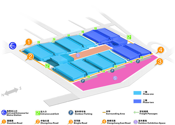 长沙国际会展中心总占地面积约800亩,包含6组12个单层无柱展馆,两个登录厅、内廊及室外展场,分两期建设。一期工程已于2016年11月建成并投入运营,主要包括北登录厅、中心广场、西广场、内廊及北面四组八个展厅,其中单馆室内展览面积1.35万㎡,室内总展览面积约11.4万㎡,可提供室内标准展位约6000个,室外展示面积约10万㎡。硬件设施设备可承接国内外各类大型专业巡回展。二期全面建成后,室内展示面积将达到17.75万㎡,是中国中部面积最大、功能最全的综合性会展中心之一。