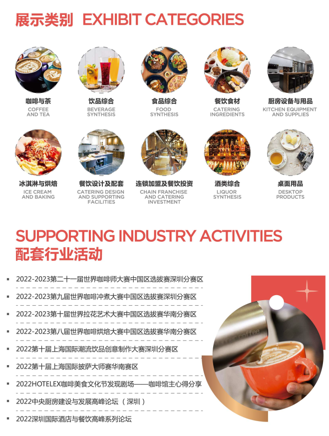 深圳国际酒店及餐饮业展HOTELEX Shenzhen展出面积16万平方米,汇聚酒店餐饮上下游产业链1000家优质展商,换新规划的八大展示板块在深化原有咖啡茶饮、餐饮设备、烹饪食材、烘焙与冰淇淋等强势品类之外,将进一步延伸产业链条,在餐饮设计、餐饮家具等领域进行多维度拓展。