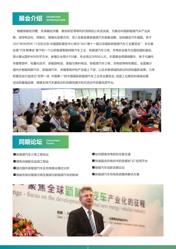 随着首都经济圈、京津冀经济圈、雄安新区等等利好消息的公布及实施,为推动中国新能源汽车产业发展,坚持电动化、网联化、智能化发展方向,深入实施发展新能源汽车国家战略,加快建设汽车强国。将于2021年06月09-11日在北京.中国国际展览中心举办“2021第十一届北京国际新能源汽车工业展览会”,本次展会是“汽车制博会”旗下的一个以新能源智能网联汽车工业、新能源汽车三电、充电桩设备为主题的国际盛会。 预计展出面积40000平方米、参展企业预计550家、专业观众50000人次。本届展会将围绕整车、电子元器件、关键零部件、轻量化技术、新能源电池、氢能与燃料电池、新能源汽车三电、充电桩等特色展区。全面展示 国内外智能网联汽车、新能源汽车、关键零部件和产业链上下游,以及关联领域的前沿科技和最新成果。力争 把展览会打造成为“世界一流 中国第一”的中国国际新能源汽车工业专业展览会, 创造工业展览和高端会展活动的最强品牌,搭建全球汽车最前沿科技展览展示和交流合作的最优质平台。