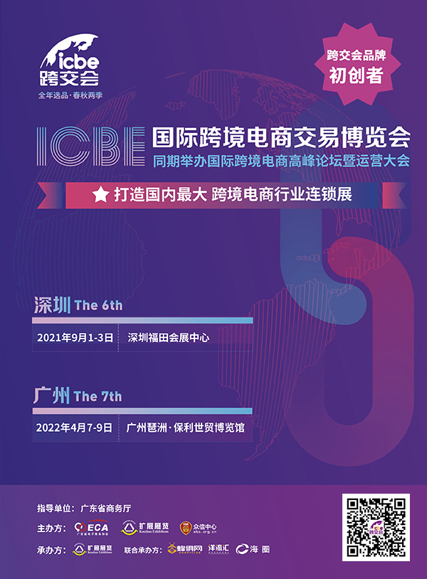 ICBE2021国际跨境电商交易博览会(简称:ICBE2021跨交会)由广东省商务厅指导,广东省电子商务协会、深圳市众信电子商务交易保障促进中心、香港扩展集团联合主办,扩展展览承办,蜂俱网、洋流汇、海圈网联合承办。ICBE2021跨交会将举办两届,第六届深圳跨交会将在2021年9月1-3日深圳福田会展中心举办,第七届广州跨交会将在2022年4月7-9日将在广州琶洲保利世贸博览馆举办。ICBE2021跨交会展示面积将扩增至100,000㎡,展商超过2,000+,预计将迎来总计100,000名专业观众莅临参观。本届展会现场将特设四大主题展区:跨境电商进出口品牌和生产厂家展区、跨境平台展区、跨境服务商展区、综试区/园区/政府/集聚地展区,汇聚跨境全产业链的品牌、工厂、电商平台、运营商、通讯、支付平台、软件、培训机构、物流快递企业等各地示范实验区、园区、移动智能终端、服务商等跨境电商全产业链,展会现场将邀请Wish、Shopee、Tophatter、eBay、速卖通、xShoppy、Shopline等行业著名平台方齐聚现场,全面展现全球跨境电商行业发展、传统企业转型、跨境电商新型服务平台等丰硕成果,满足更多行业企业的需求。ICBE2021国际跨境电商展,期待您的莅临!深圳跨境电商展