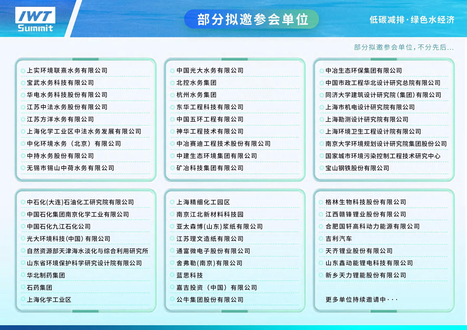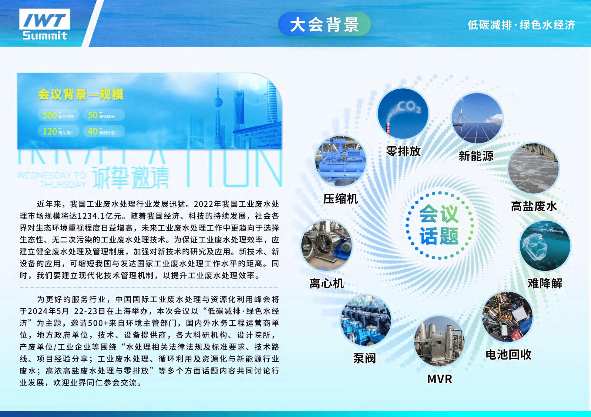 为更好的服务行业,2024年第三届中国国际工业废水处理与资源化利用峰会将于2024年5月 22-23日在上海举办,本次会议以“低碳减排·绿色水经济”为主题,邀请500+环境主管部门,国内外水务工程运营商单位,地方政府单位,技术设备提供商,各大科研机构、设计院所,产废单位/工业企业等围绕“ 水处理相关法律法规及标准要求、技术路线、项目经验分享;工业废水处理、循环利用及资源化与新能源行业废水;高浓高盐废水处理与零排放”等多个方面话题内容共同讨论行业发展,欢迎业界同仁参会交流。