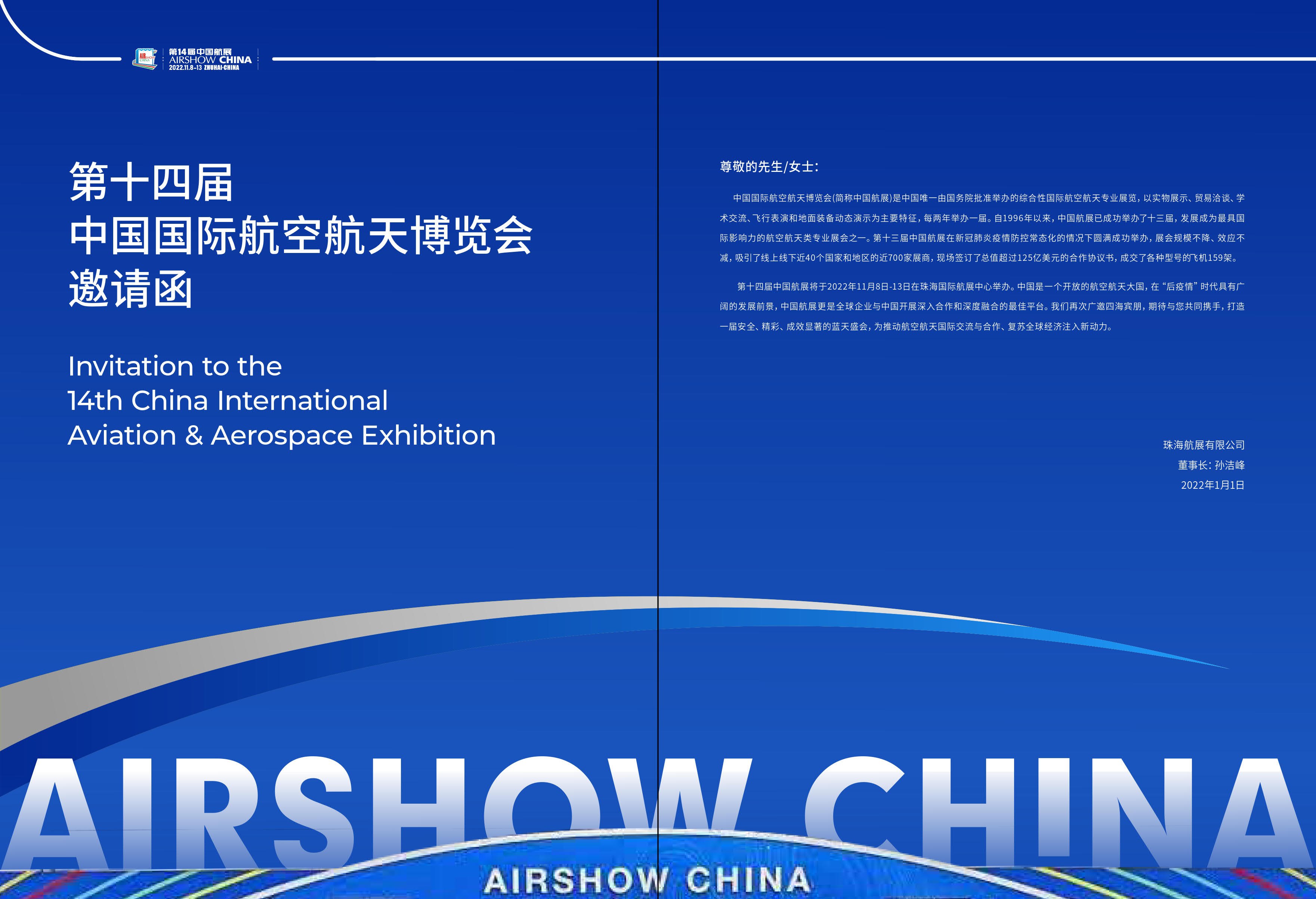 第十四届中国航展将于2022年11月8日-13日在珠海国际航展中心举办。中国是一个开放的航空航天大国,在“后疫情”时代具有广阔的发展前景,中国航展更是全球企业与中国开展深入合作和深度融合的最佳平台。我们再次广邀四海宾朋,期待与您共同携手,打造一届安全、精彩、成效显著的蓝天盛会,为推动航空航天国际交流与合作、复苏全球经济注入新动力。