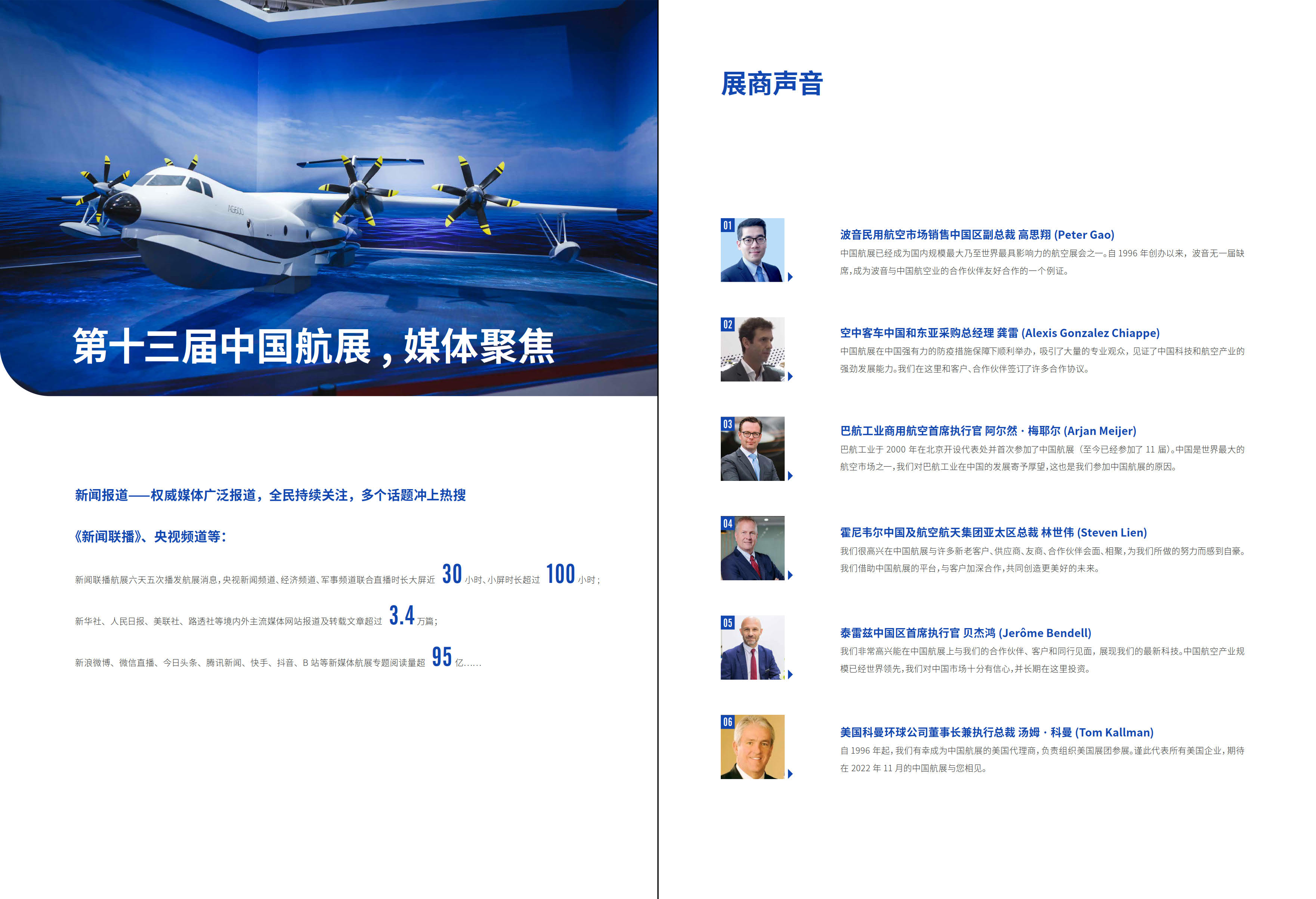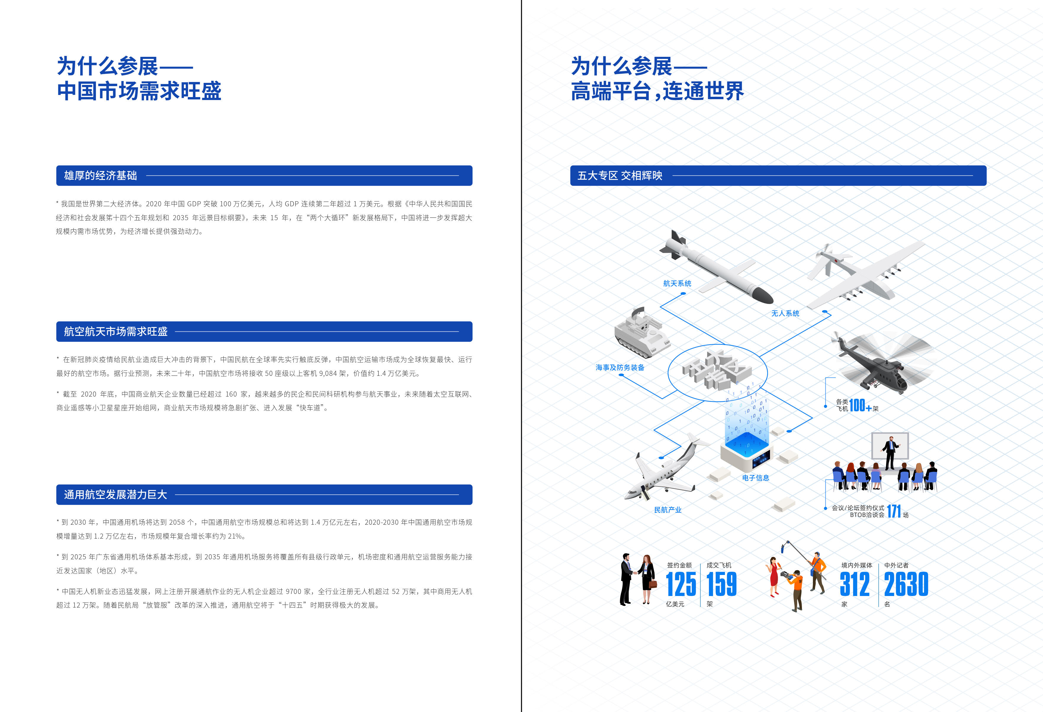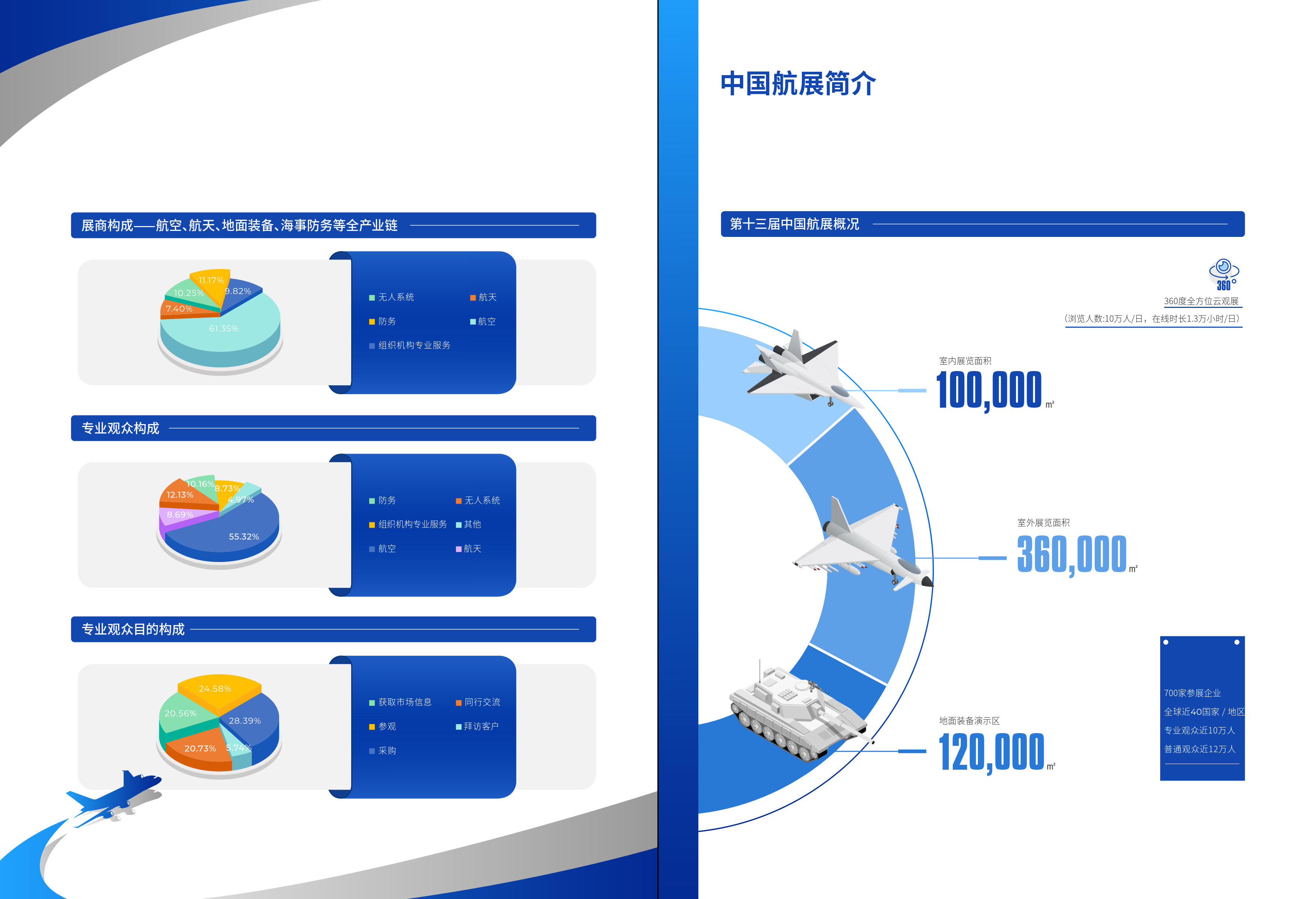 中国国际航空航天博览会(简称中国航展)是中国唯一由国务院批准举办的综合性国际航空航天专业展览,以实物展示、贸易洽谈、学术交流、飞行表演和地面装备动态演示为主要特征,每两年举办一届。自1996年以来,中国航展已成功举办了十三届,发展成为最具国际影响力的航空航天类专业展会之一。第十三届中国航展在新冠肺炎疫情防控常态化的情况下圆满成功举办,展会规模不降、效应不减,吸引了线上线下近40个国家和地区的近700家展商,现场签订了总值超过125亿美元的合作协议书,成交了各种型号的飞机159架。