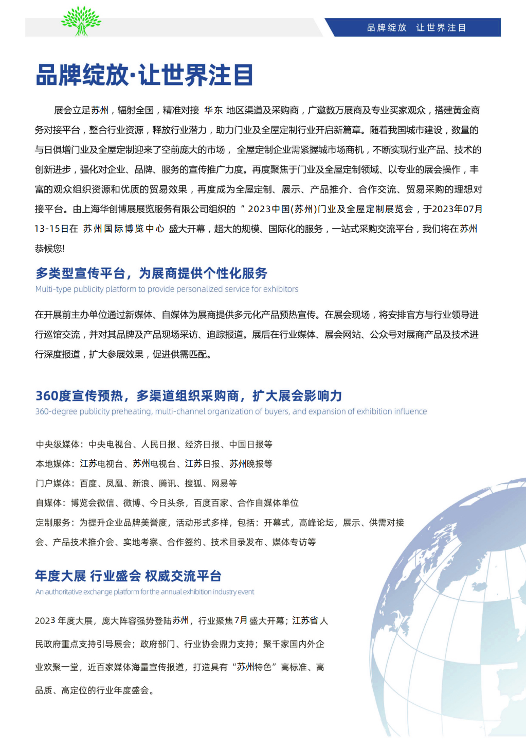 内容摘要: 姑苏名城 盛世苏州 CDBE 2023 中国 ( 苏州 )国际门业及 全屋定制展览会 时间:2023年07月13-15日 地址:苏州国际博览中心 主办单位:雷科集团 承办单位:上海华创博展展览服务有限公司……