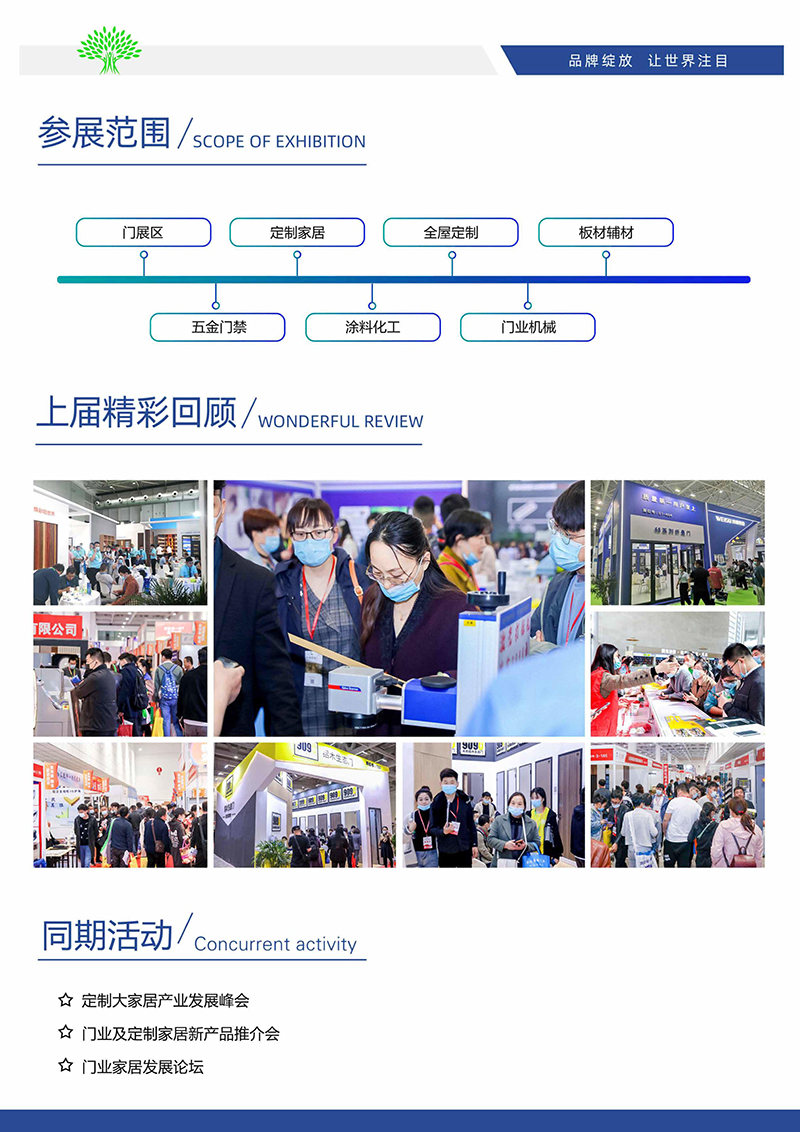 门展区:括实木门、装饰工艺门、生态门、铝门、铜门、移门、钢质门、钢木门、金属门、竹木门、入户门、别墅门、自动门、防盗门、防火门、复合门、模压门、木塑门、庭院门、隔断门、百叶门、折叠门、橱柜门、保温门、铝塑门、快速卷门、自动工业门、滑动拉门、家居门、旋转自动门、自动感应门等;