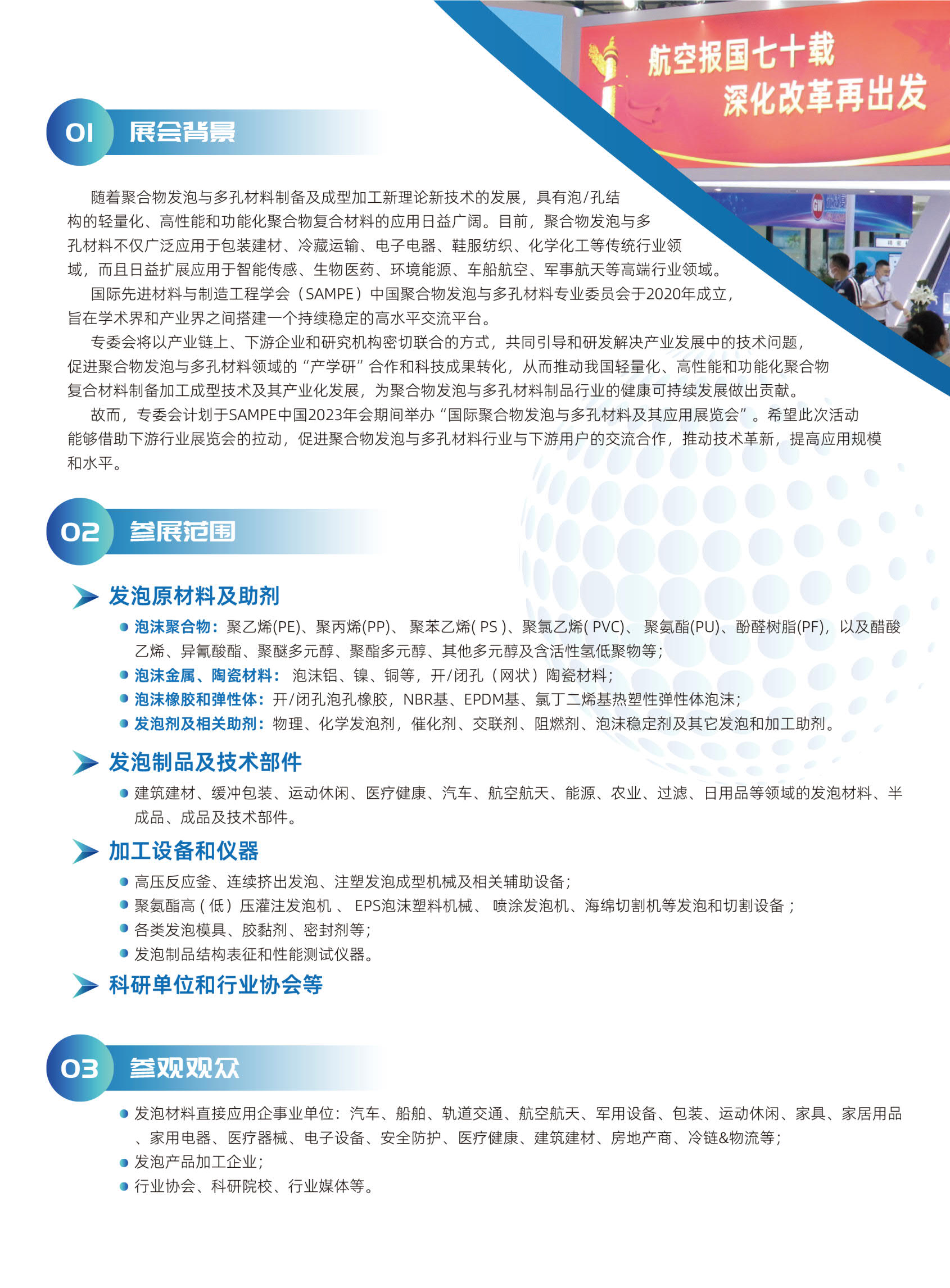 国际先进材料与制造工程学会(SAMPE)中国聚合物发泡与多孔材料专业委员会于2020年成立,旨在学术界和产业界之间搭建一个持续稳定的高水平交流平台。专委会将以产业链上、下游企业和研究机构密切联合的方式,共同引导和研发解决产业发展中的技术问题,促进聚合物发泡与多孔材料领域的“产学研”合作和科技成果转化,从而推动我国轻量化、高性能和功能化聚合物复合材料制备加工成型技术及其产业化发展,为聚合物发泡与多孔材料制品行业的健康可持续发展做出贡献。
