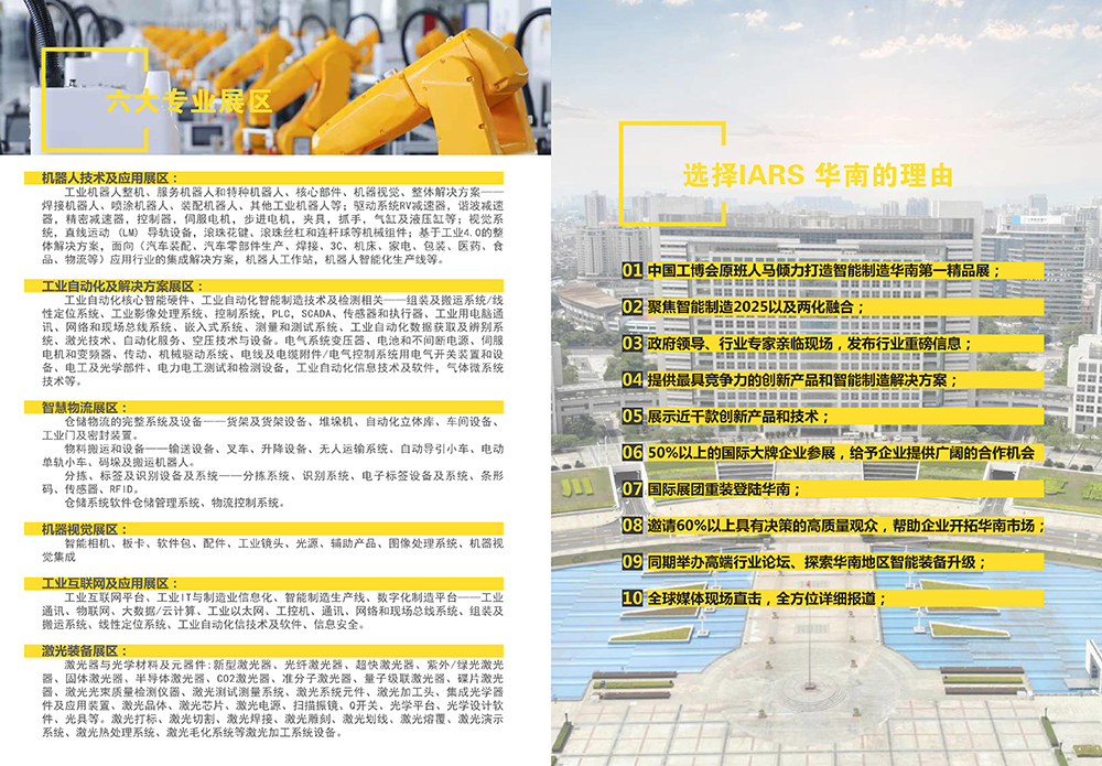 第三届中国(华南)国际自动化与机器人 展览会(以下简称华南展)是中国国际工 业博览会优势展(机器人展与自动化展) 在华南地区的***异地专业展会,也是继 2018年武汉国际自动化与机器人展览会之 后的第二站。主办单位东浩兰生会展集团 将继续携手工博会的机器人展(RS)与自 动化展(IAS)的优质展商落地“华南工 业展览之都”广东省东莞市,结合全国制 造业增长速度最快华南地区的发展特点, 继续打造以机器人与自动化相关技术和装 备为核心的精品展。