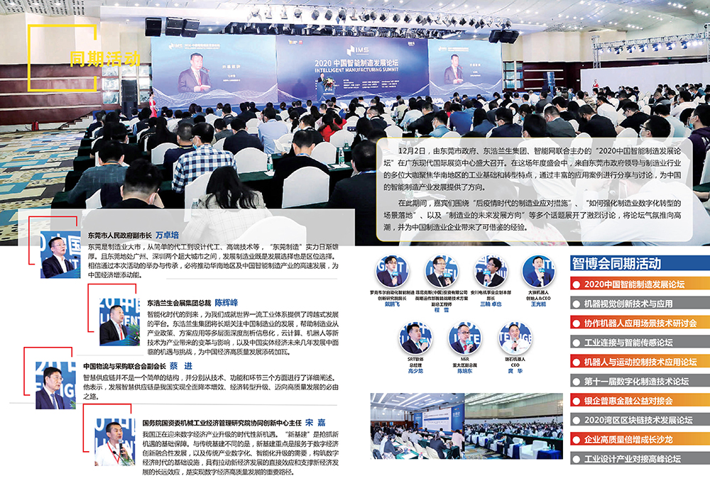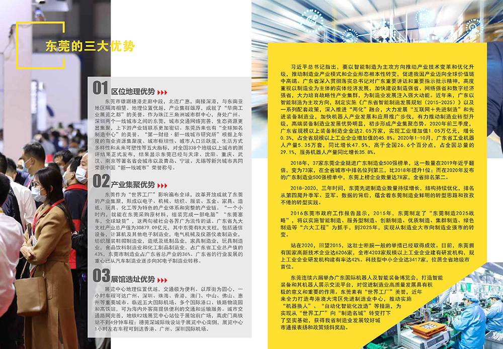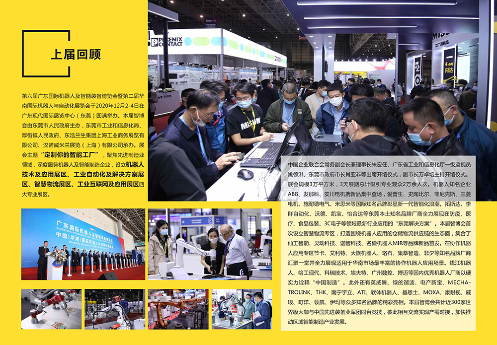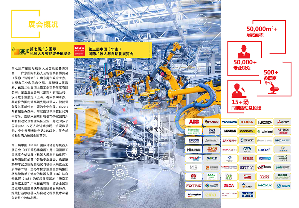 第七届广东国际机器人及智能装备博览 会——广东国际机器人及智能装备博览会 (简称“智博会”)由东莞市政府主办, 东莞市工业和信息化局、厚街镇人民政 府、东浩兰生集团上海工业商务展览有限 公司、东浩兰生会展(东莞)有限公司、 汉诺威米兰展览(上海)有限公司承办, 其定位为国内外高端先进机器人、智能装 备及其零部件为主题的专业年展。自2015 年首届举办以来,展览面积平均超过10万 平方米,连续六届累计吸引7000家国内外 知名自动化及智能装备企业,超过30多个 国家共55.77万人次进场参观、洽谈和采 购,专业参观者比例达95%以上,展会规 模和影响力位居全国前列。
