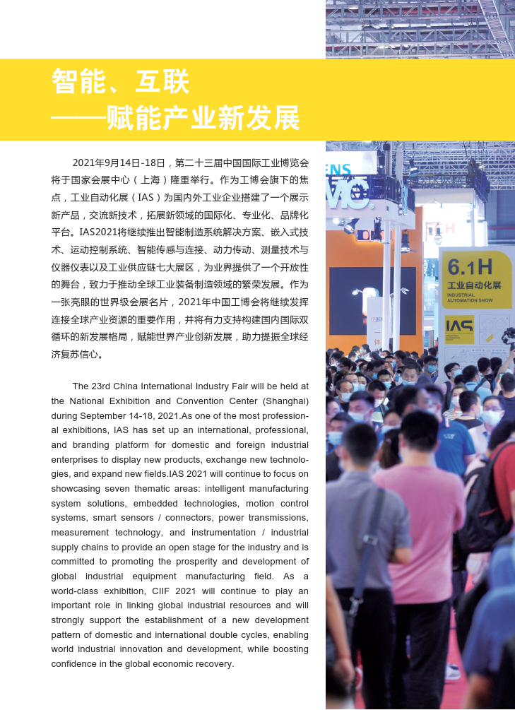 作为"中国国际工业博览会"旗下最受瞩目的专业展之一,工业自动化展(IAS)全面展示生产、过程自动化的最新技术和全面解决方案、电气系统、工业IT与制造业信息化、微系统技术。十余年的品牌沉淀,IAS的展示规模、展品水平和国际影响力在亚洲地区首屈一指。为业内同行提供了商贸采购、企业品牌拓展、交流学习的绝佳平台。
