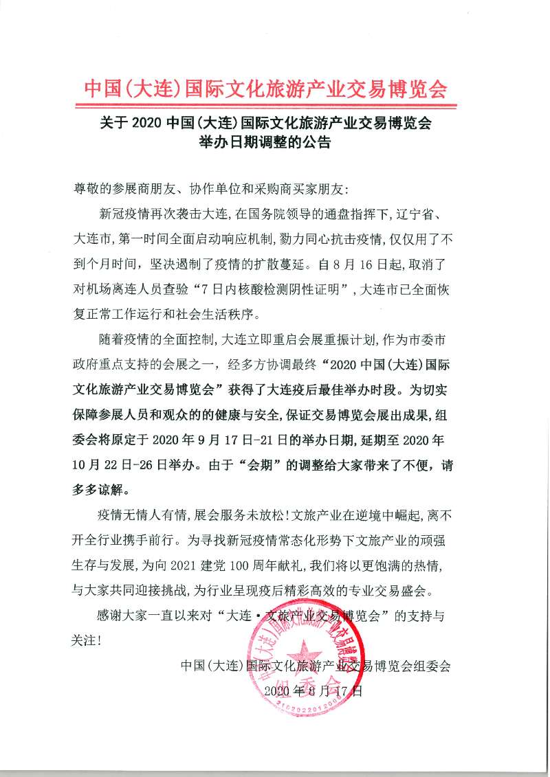 关于2020中国(大连)国际文化旅游产业交易博览会举办日期调整的公告