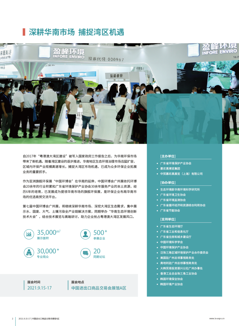作为亚洲旗舰环保展“中国环博会”在华南的延伸,中国环博会广州展依托环博会20余年的行业积累和广东省环境保护产业协会30余年服务产业的本土资源,历经6年的培育,以发展成为提领华南地区的旗舰环保展,是环保企业布局华南市场的优选商贸交流平台。