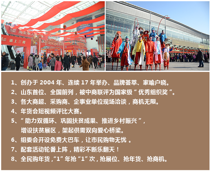 “济南年货会”创办于2004年,已成功举办十七届,是政府重点扶持和培育的节庆消费类大型会展项目。被中国商业联合会连续多次评为“最佳组织奖”。经过17年发展升级,无论是参展规模、展览面积还是观众流量都逐年递增,累计参展企业达1.6万余家,参观观众约计340余万人次。其中,2020济南年货会参展企业突破1200余家,展出面积3万余平方米,消费者超过30万人次,是山东省乃至整个北方地区规模最大、品种最全、人气最旺的岁末年货盛宴。