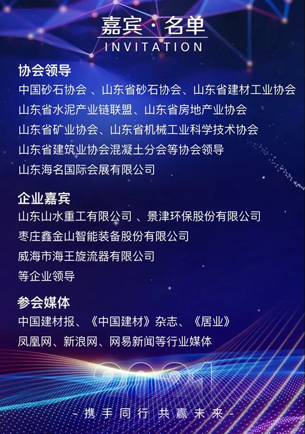 会议诚邀山东山水水泥集团有限公司、枣庄鑫金山智能装备股份有限公司、景津环保股份有限公司、威海市海王旋流器有限公司、功力集团、淄博大力矿山机械有限公司、山东临工集团、山东金宝山机械有限公司、山东德润丰工程机械有限公司、锦华环保装备山东有限公司、山东高唐华通液压机械有限公司、山东科利机电工程有限公司、山东汇丰重矿机械智造有限公司,徐工集团等企业领导参与,行业龙头齐聚、大咖云集,各企业领军人物将受邀分享多年从业经验及经营理念,指导砂石企业寻找到符合市场需求、符合企业定位的发展新思路。