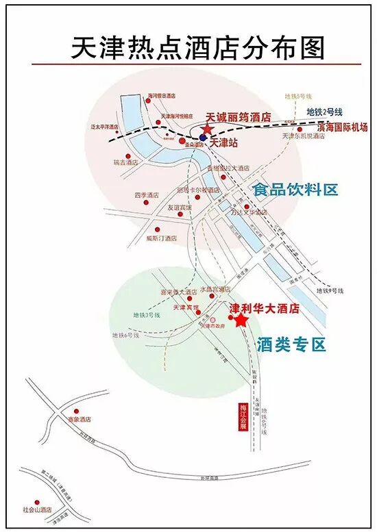 ( 一 ) 参展范围 酒类、食品饮料、调味品、食品添加剂、食品包装、食品机械 等产品及相关技术、服务项目。 ( 二 ) 参展流程 提交参展申请→参展资质审核→展位配置洽谈→签订合同并提 交承诺书→按时支付款项→领取《展位证》→凭《展位证》报 到并领取《展商证》→入场布展→展示交易→撤展 申 请 参 展 请 联 系 糖 酒 会 招 商 组及本届糖酒会相关组展单位 (舒经理:15002865148)。 ( 三 ) 参展资质 1、参展单位及展品须符合国家法律、法规及国家标准、行业 标准的相关要求。 2、 申请展位时须提供如下资料(所有资料均须加盖参展单位 公章):单位资料:合法有效的营业执照或单位登记注册的相关法律文件 展品资料: (1)涉及国产展品的单位须提供: A. 参展展品的详细清单; B. 与展品清单匹配的生产许可证,商贸企业和餐饮企业还须 提供相应的食品经营许可证(或食品流通许可证、餐饮服务许 可证); C. 保健品类展品,还须提供相关部门的批准证书。特别提醒:涉及国产食品类展品的参展单位须带齐近半年第三 方机构出具的与展品清单完全对应的产品检验报告参展,以备 相关部门随时查验。 (2)涉及海外展品的单位须提供: A. 参展展品的详细清单; B. 与展品清单匹配的中华人民共和国出入境检验检疫卫生证 书及入境货物检验检疫证明(需自行办理相关手续); C. 商贸企业和餐饮企业须提供相应的食品经营许可证(或食 品流通许可证、餐饮服务许可证)。 D. 涉及商标、原产地等知识产权保护的海外展品须提供相应 的资质及证明文件。 注:上述(1)、(2)两项中需提供相应生产许可证、食品 经营许可证(或食品流通许可证、餐饮服务许可证)的单位均 指在中国大陆登记注册的相关企业。 天津津利华大酒店(天津市河西区友谊路32号) 天津燕园国际大酒店(喜来登酒店)(天津市河西区紫金山路31号) 天津迎宾馆(天津市河西区马场道335号) 天津天诚丽筠大酒店(天津市河东区新开路66号)