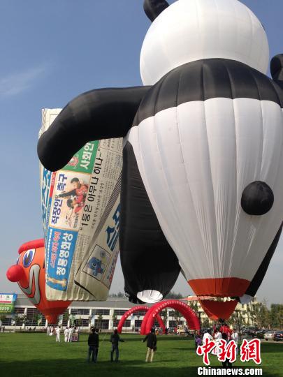 图为河北廊坊国际热气球节上,来自德国的小丑球和来自韩国的报纸热气球亮相