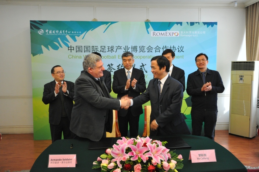 2月22日,中国国际展览中心集团(简称中展集团)与意大利罗马展览公司(简称ROMEXPO)在京就中国国际足球产业博览会合作协议举行了签约仪式。中国贸促会副会长陈洲、贸促会贸易投资促进部部长林舜杰、中展集团总裁贺彩龙、副总裁王晓光、ROMEXPO意大利罗马展览公司主席Armando先生、中展集团北京华港展览有限公司总经理张云崖、中展集团管理公司总经理徐强等出席签约仪式。中展集团总裁贺彩龙、ROMEXPO主席Armando分别代表两家公司在协议上签字。