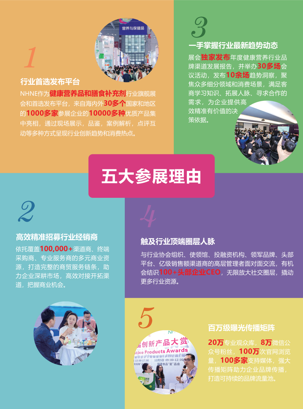 中国国际健康营养博览会(NHNE)是亚洲健康营养与保健食品行业旗舰展会,被誉为行业发展的“风向标”。展会规模近40,000平方米,每届展会汇集1200家来自全球30多个国家和地区的功能食品原料、功能食品配料、新资源食品、保健食品、膳食补充剂、健康食品、功能食品和饮料、营养滋朴品、特殊营养食品/特殊藤食、特殊医学用途配方食品、益生菌、保健用品、OEM制造、商业服务等十余个细分领域的产品和服务供应商,预计吸引12万人次全渠道的专业买家采购洽谈。以展会为载体,通过展览展示、峰会论坛、资源对接、内容传播、人脉拓展等多个服务矩阵,同时利用数字化创新赋能,为产业链各端提供线上线下一体化市场解决方案。