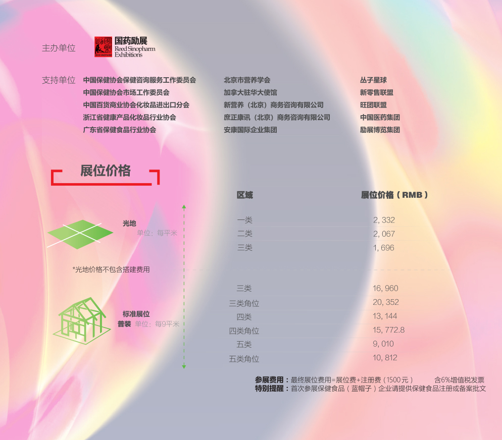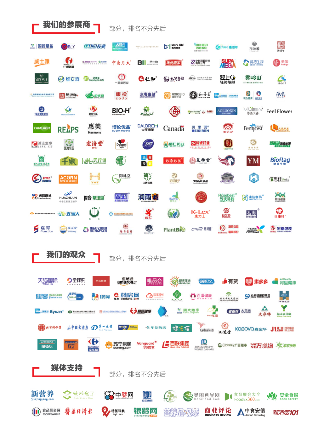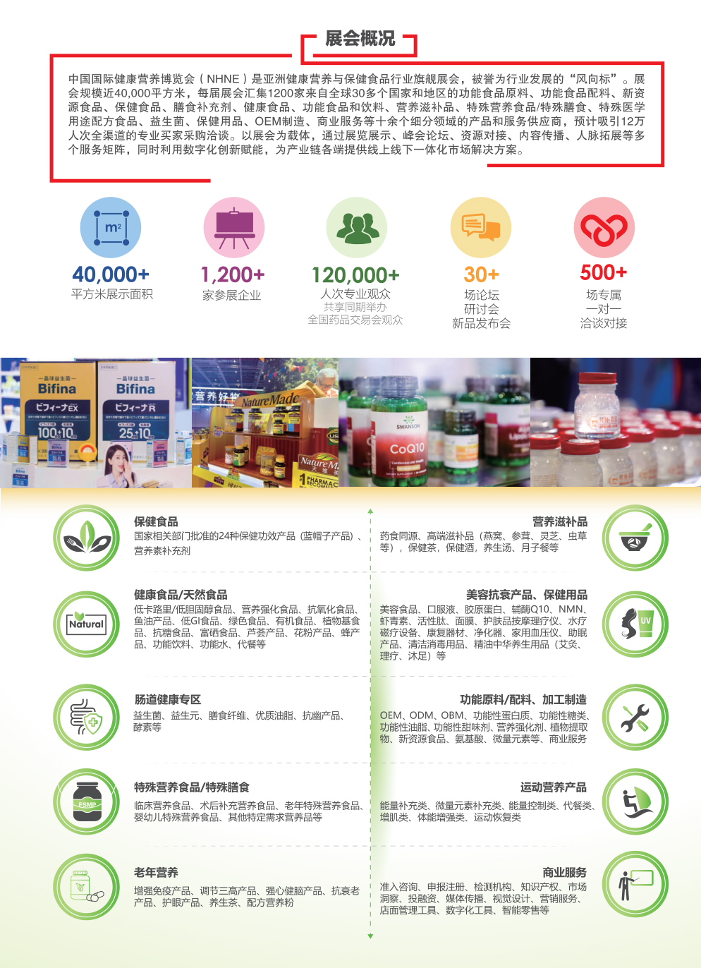 展示内容:#保健食品、#膳食补充剂、#健康食品、#滋补食品、#益生菌、#功能食品原料/配料、#新资源食品、#功能饮料、#特殊营养食品/#特殊膳食、#特殊医学用途配方食品、#保健用品、#OEM制造、#商业服务 等