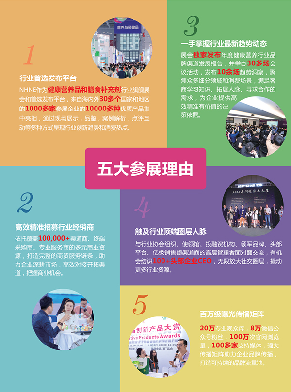 由国药励展主办的中国国际健康营养博览会(NHNE)是亚洲破具规模的健康营养与保健品专业展会,通过一年两届展览,将展览展示、峰会沙龙、互动体验、贸易对接融为一体,致力于打造全球健康营养产业的专业化贸易和体验式互动平台。
