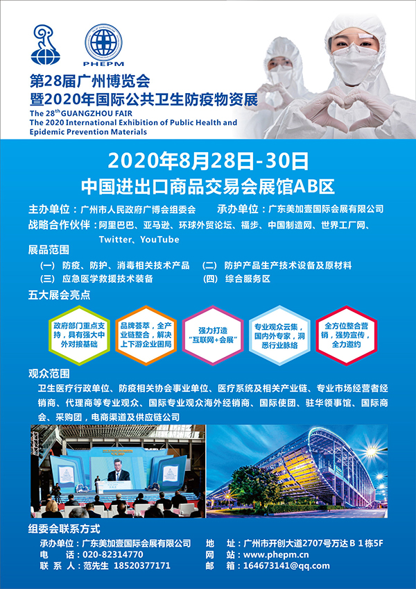 第28届广州博览会暨2020年国际公共卫生防疫物资展 The 28 GUANGZHOU FAIR The 2020 International Exhibition of Public Health and Epidemic Prevention Materials 时间:2020年8月28日-30日 地点:中国进出口商品交易会展馆主办单位 广州市人民政府广博会组委会承办单位 广东美加壹国际会展有限公司战略合作伙伴 阿里巴巴、亚马逊、环球外贸论坛、福步、中国制造网、世界工厂网、Twitter、YouTube