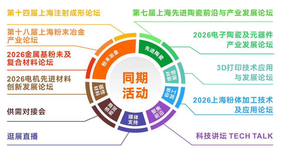 本次第十八届中国国际粉末冶金及硬质合金展览会(PM CHINA 2026)将与第十八届中国国际先进陶瓷展览会(IACE CHINA 2026)、2026上海国际磁性材料与应用产业链展览会(MMIC CHINA 2026)、2026上海国际增材制造应用技术展览会(AM CHINA 2026)、2026上海国际粉体加工与处理展览会(POWDEX CHINA 2026)同期同地举办。五展协同的平台布局,串联从材料研发、生产制造到终端应用的完整产业链,助力展商一次性链接上下游合作伙伴,拓宽业务边界。