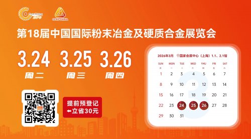 第十八届中国国际粉末冶金及硬质合金展览会(PM CHINA 2026)将于3月24-26日,在国家会展中心(上海)1.1馆、2.1馆盛大开幕。
