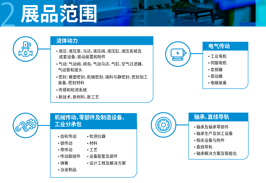展会展品范围涵盖了液压、气动、密封、齿轮、电机、传动联结件、链传动、带传动、弹簧、轴承和工业分承包等11 大类,为未来智能工厂的落地提供了核心零部件一站式的采购平台。