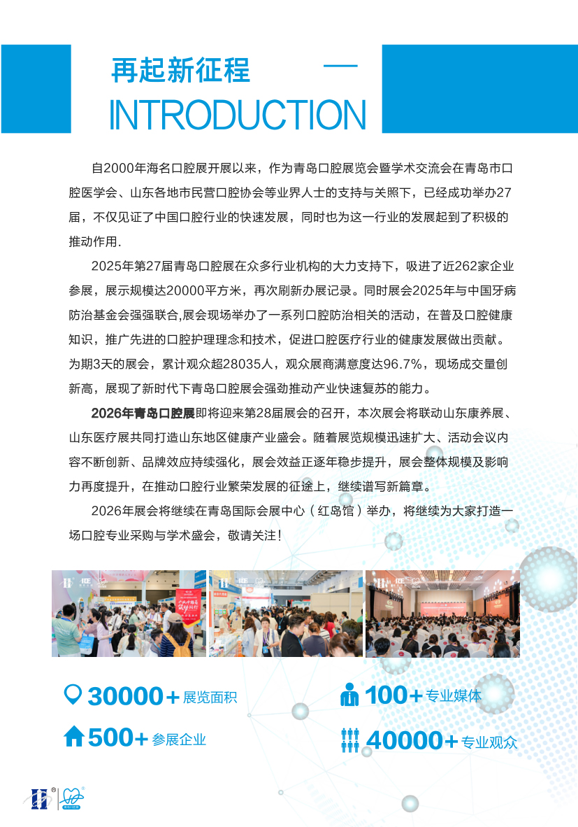 2026年青岛口腔展将迎来第28届展会的召开,随着展览规模迅速扩大、活动会议内容不断创新、品牌效应持续强化,展会效益正逐年稳步提升,自2024年青岛口腔展将移师至青岛国际会展中心(红岛馆)举办后,展会整体规模及影响力再度提升,在推动口腔行业繁荣发展的征途上,翻开崭新篇章。