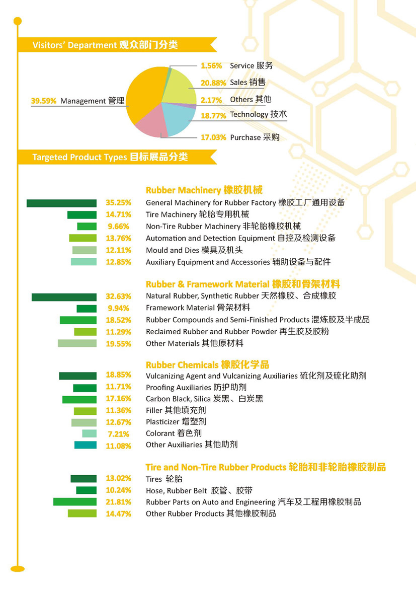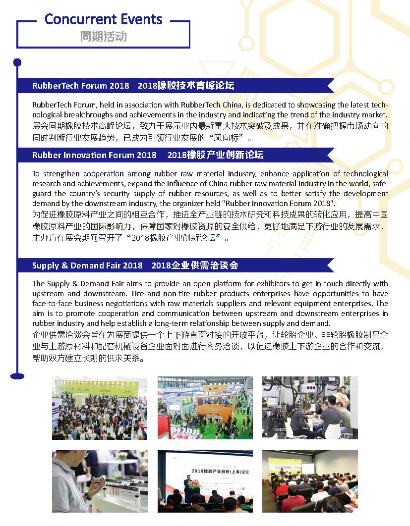 中国国际橡胶技术展览会,自1998年开始,经历了多年的办展历程,现已成为行业内企业进行品牌宣传及贸易促进的平台,成为信息沟通、新技术交流的通道,成为国际橡胶工业发展的风向标和促进剂。伴随着国际橡胶工业的高速增长,展会现已汇集展商近700家,展览面积达到50000多平方米,是真正国际领先的大型专业性展会,展商来自世界近30个国家和地区,集橡胶机械设备、橡胶化学品、橡胶原材料和橡胶制品和半成品为一体,是橡胶行业相关企业各个环节操作者不可错过的年度盛会。