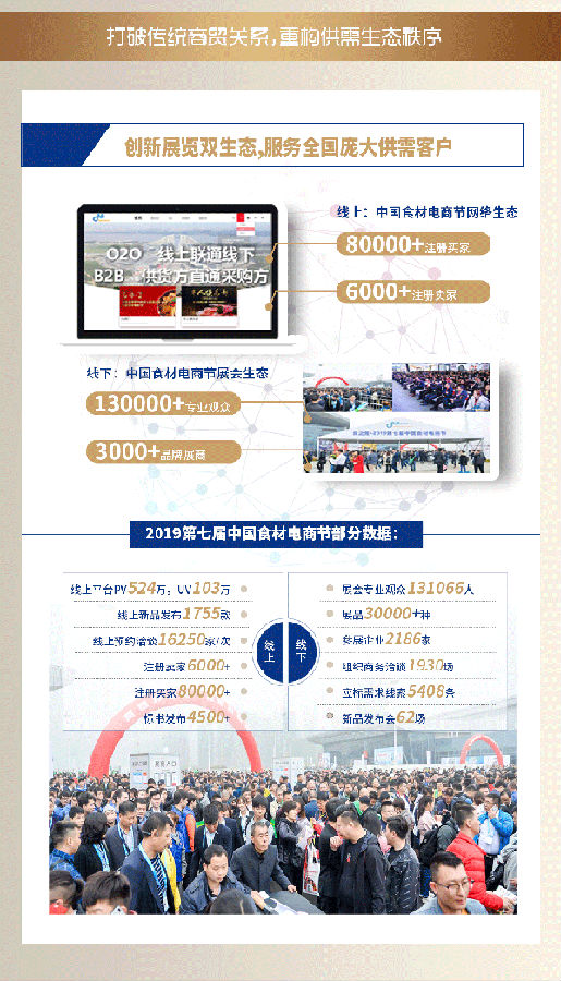 作为疫后行业“打破传统商贸关系·重构供需生态秩序”的大展,本届中国食材电商节新增米面粮油、餐饮专用的饮品及酒类,餐饮加盟等主题展区,全力打造疫后行业规模最大品类最全的年度盛会。