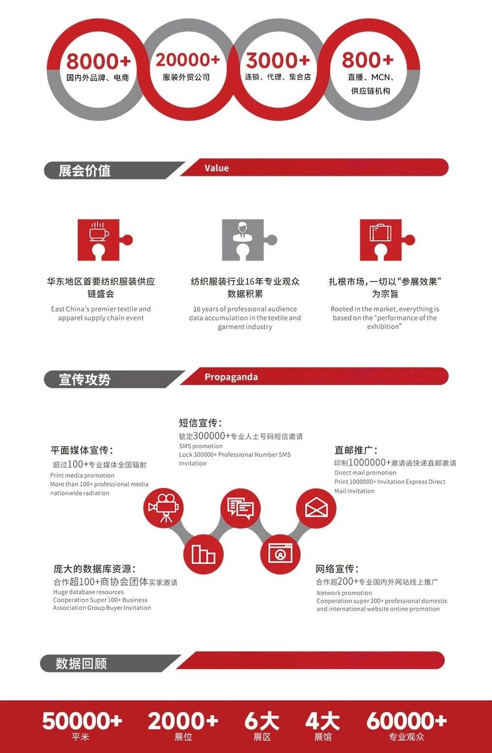 第33届中国(杭州)国际纺织服装供应链博览会-杭州是中国电子商务的发源地,也是国内知名服装品牌的集中区域,聚集了一大批极具市场竞争力与创新活力的服装、电商企业。本届展会将充分发挥杭州“中国女装之都”、“电商直播之都”得天独厚的优势,全方位进行升级提升。杭州纺织服装供应链博览会,自2000 年首次举办至今,组委会数据库已累积国内外合作品牌、电商8000 多家,服装外贸公司 20000 多家,大中型商场超市连锁集合店 3000 多家,直播 MCN 供应链机构800 多家。随着全球纺织服装产业的迅速发展而不断壮大。历届展会的佳绩证明,“杭州服装供应链博览会”目前已成为行业内服装品牌商、批发商、电商、外贸公司等终端商与国内外顶尖贸易公司最佳选择的聚焦之会。本届展会依托主办方 20余届办展经验和丰富的行业资源优势,在采购商邀请、现场配套活动设置等方面也做出了新的探索,在前期招商、展会现场、后期宣传等阶段已形成了一套系统的推广方案,并结合新型传播载体全方位提升博览会影响力。