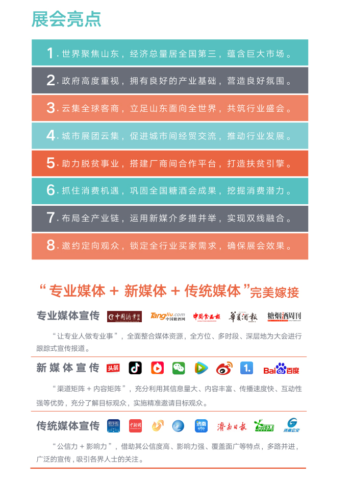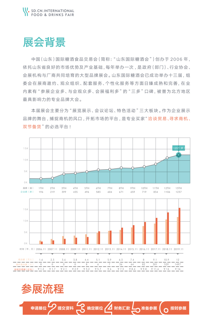 中国(山东)国际糖酒食品交易会(简称:“山东国际糖酒会”)创办于2 0 0 6 年,依托山东省良好的市场优势及产业基础,每年举办一次, 是政府(部门)、行业协会、会展机构与厂商共同培育的大型品牌展会。山东国际糖酒会已成功举办十三届,组委会在展商邀约、观众组织、配套服务、个性化服务等方面日臻成熟和完善,在业内素有“参展企业多、与会观众多、会展福利多”的“三多”口碑,被誉为北方地区影响力的专业品牌大会。